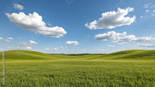 Fototapeta premium Lush green hills under bright blue sky with fluffy white clouds create serene...