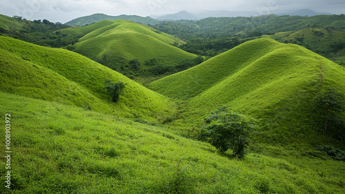 © Sajib, Fototapeta premium Lush green hills under cloudy skies in a serene landscape during the daytime