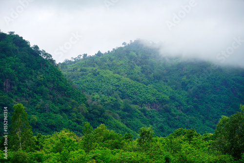 © sakhorn38, Obraz premium Lush Green Hills with Misty Clouds and Overcast Sky in Nature
