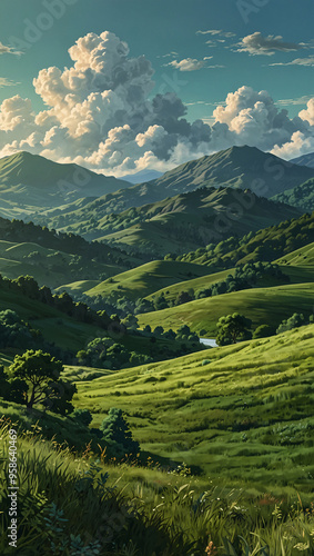 Naklejka premium Lush Green Hills with Rolling Clouds