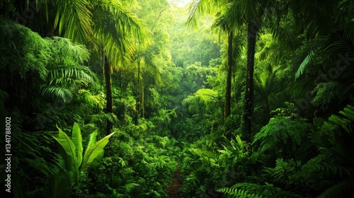 © Asayamrad, Fototapeta premium Lush green jungle filled with tall trees and dense foliage, creating a serene and vibrant atmosphere.