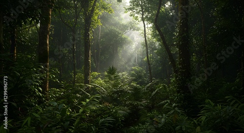 Obraz premium Lush Green Jungle Forest with Sunlight Streaming Through Trees