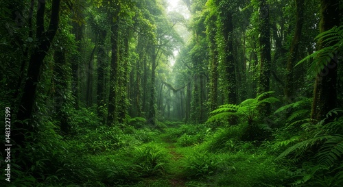 Fototapeta premium Lush Green Jungle Path - Serene jungle path, vibrant foliage, sunlight filtering through canopy, peaceful atmosphere, sense of exploration