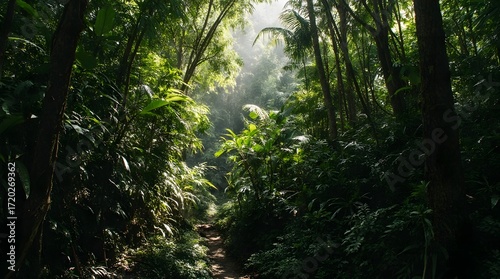 Obraz premium Lush Green Jungle Pathway with Sunlight Streaming Through Trees Creating a...