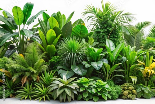 © Wanlop, Fototapeta premium Lush Green Jungle Plants Set: A Panoramic View of Diverse Vegetation Featuring Group of Green Bushes Isolated on a Crisp White Background for Botanical Visuals and Nature Themes
