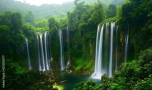 Naklejka premium Lush green jungle waterfall cascading into pool. Nature background, travel,...