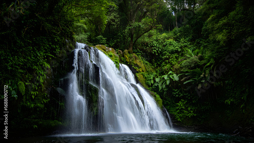 Obraz premium Lush green jungle waterfall cascading over mossy rocks into dark water forest