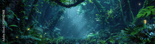 © kraphix, Fototapeta premium Lush green jungle with dappled sunlight filtering through trees.