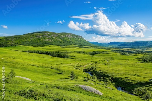 © Uliana, Fototapeta premium Lush green landscape under a bright sky during Midsommar in Sweden.