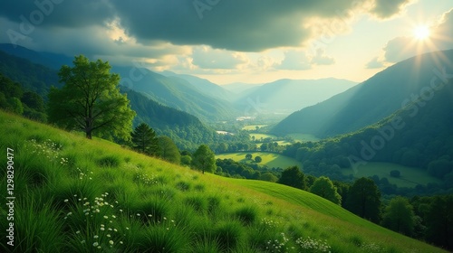 © junet, Fototapeta premium Lush green landscape under a dramatic, cloudy sky.