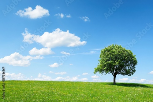 Obraz premium Lush green landscape with a single tree against a bright blue sky filled with...