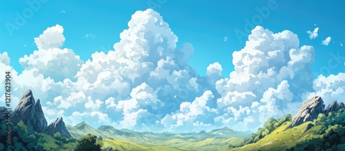 Fototapeta premium Lush green landscape with rolling hills and dramatic cumulus clouds under a bright blue sky Copy Space