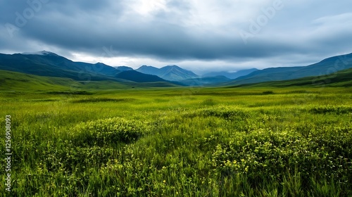 Fototapeta premium Lush green landscape with rolling hills under a dramatic cloudy sky...