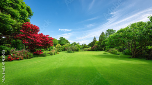© MasTPX, Naklejka premium Lush green lawn surrounded by vibrant trees and flowe shrubs under a bright blue sky creates a peaceful and inviting landscape in a beautiful garden setting.