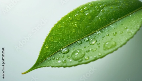 Fototapeta premium Lush Green Leaf with Dew Drops Nature s Freshness Close Up Macro Photography