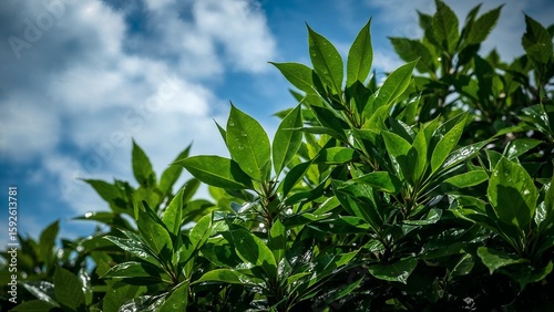 © Ajigus, Obraz premium Lush green leaves against a partly cloudy sky.
