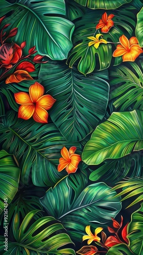 Naklejka premium Lush green leaves and bright orange flowers create a vibrant tropical atmosphere filled with natural beauty