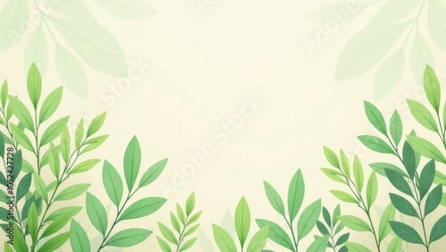 Fototapeta premium Lush green leaves border a serene, pastel-colored background, creating a...