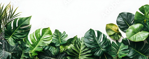 © SemangArt, Naklejka premium Lush green leaves border, white backdrop. Website banner