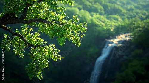 © Arthur Constantine, Obraz premium Lush Green Leaves Framing A Serene Waterfall Amidst Nature's Splendor