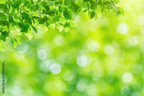 Fototapeta premium Lush green leaves hang from branches, framing a sun-drenched background of soft, blurred bokeh circles in varying shades of verdant green and yellow
