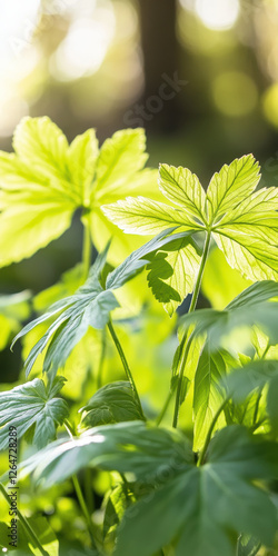 Obraz premium Lush green leaves illuminated by sunlight in a tranquil forest setting...