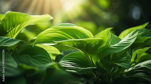 © venusvi, Obraz premium Lush green leaves on a vibrant plant with soft sunlight filtering through