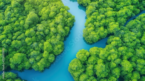 Naklejka premium Lush green mangrove forest, turquoise river winding through
