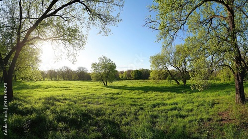 © Rahmat, Obraz premium Lush green meadow bathed in golden sunlight under a clear sky.