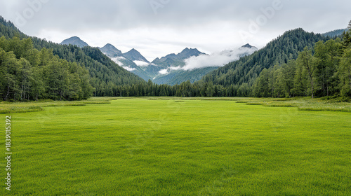 © siraphol, Naklejka premium Lush green meadow leading to misty mountain range with forested slopes and calm mood