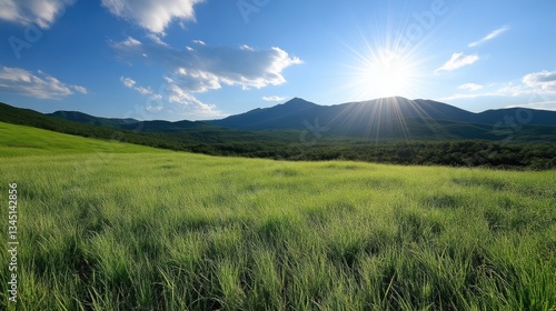 Fototapeta premium Lush green meadow, mountains, blue sky