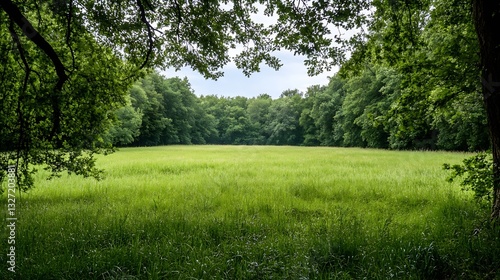 Fototapeta premium Lush green meadow surrounded by dense trees creating a peaceful and serene...