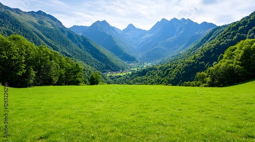 © Biggy, Naklejka premium Lush Green Meadow Surrounded by Majestic Mountains under Blue Sky