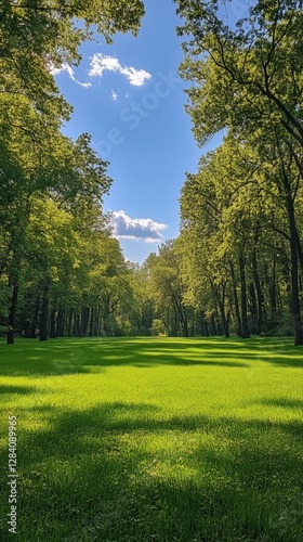 Obraz premium Lush Green Meadow Surrounded by Trees on a Sunny Day in a Serene Park