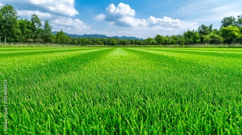 © Tri, Fototapeta premium Lush Green Meadow Under Blue Sky: Serene Landscape