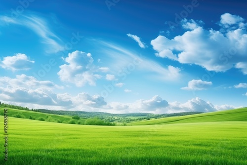© DailyStock, Fototapeta premium Lush Green Meadow Under Clear Blue Sky. Fluffy White Clouds on a Sunny Day Landscape Background