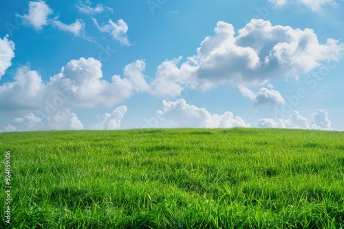 Fototapeta premium Lush Green Meadow Under Clear Blue Sky. Fluffy White Clouds on a Sunny Day...