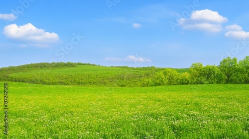 © ปฏิภาน ผดุงรัตน์, Obraz premium Lush Green Meadow Under Clear Blue Sky with White Clouds