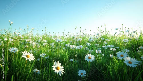 Fototapeta premium Lush Green Meadow with Daisies Under a Clear Blue Sky, Perfect for Spring and...