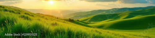 © Thanwara, Fototapeta premium Lush green meadows and hills bathed in golden light, verdant, meadow