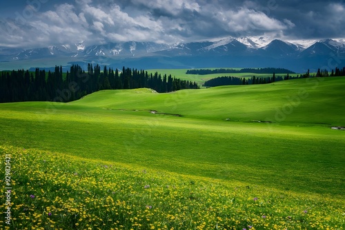 © Boy, Obraz premium Lush green meadows with mountain backdrop.