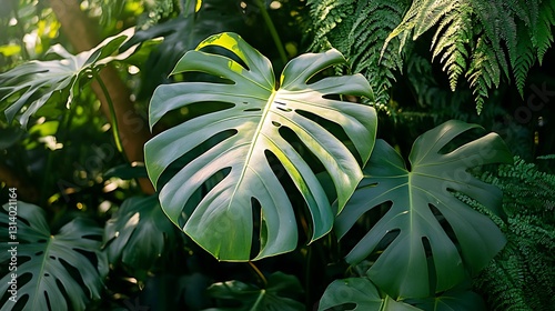 Fototapeta premium Lush green Monstera deliciosa leaf with ferns in sunlight.