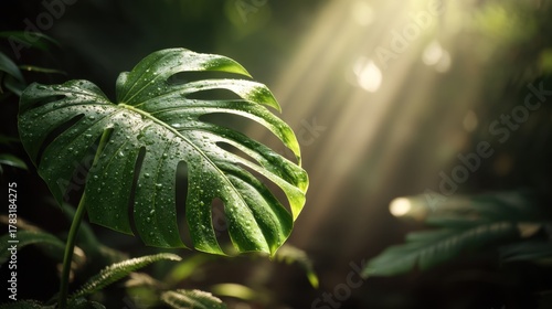 © buraratn, Fototapeta premium Lush Green Monstera Leaf with Water Droplets Illuminated by Sunlight in a Serene Jungle Setting
