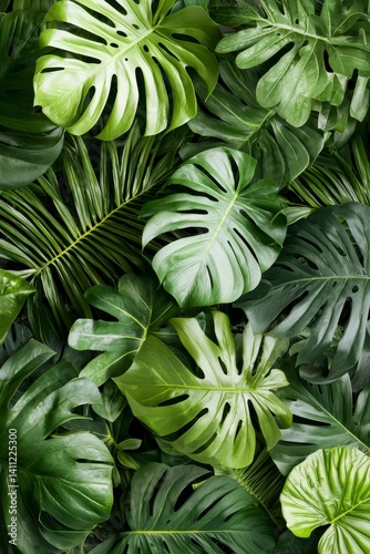 Fototapeta premium Lush green monstera leaves nature background botanical composition indoor environment close-up view organic aesthetics