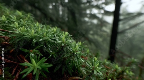 Fototapeta premium Lush Green Moss and Dewy Foliage in Misty Forest with Soft Focus and Nature...