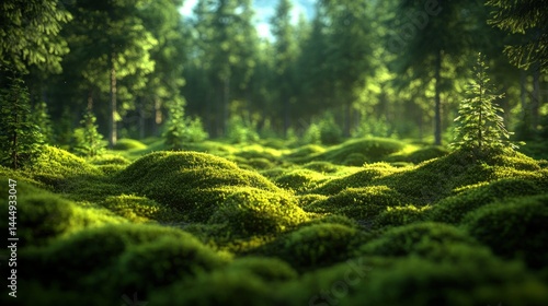 Fototapeta premium Lush green moss carpet in a sunlit forest. Focus on the foreground moss with...