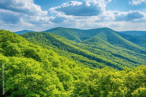 © Sarinya, Fototapeta premium Lush Green Mountain Range Landscape View from Above on Sunny Day with Blue Sky and Clouds in Summer
