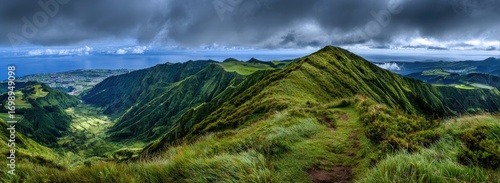 © Fire Light, Fototapeta premium Lush green mountain range panorama under dramatic sky