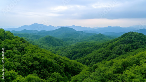 © Nadiyah, Fototapeta premium Lush green mountain range under a light cloudy sky. Possible use Nature background, desktop wallpaper