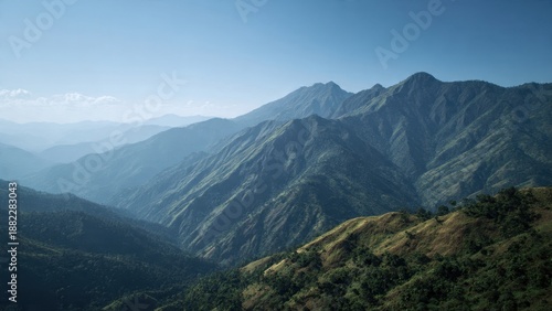 © darshika, Naklejka premium Lush green mountain range under blue sky